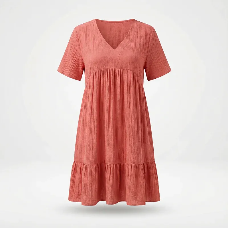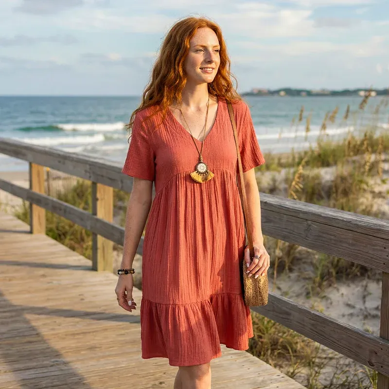 Dieses schicke Kleid bringt einen Hauch von naturinspirierter Schönheit in Ihre Garderobe. Es ist perfekt für Strandtage, lockere Treffen oder entspannte Urlaube und bietet vielseitigen Stil. An kühleren Abenden lässt es sich einfach mit Jacken oder Cardigans kombinieren. Der leichte Stoff sorgt für Komfort an warmen Tagen und hält Sie trocken und angenehm. Dieses Sommerkleid besticht durch einen schmeichelhaften V-Ausschnitt, der Ihre natürliche Silhouette stilvoll betont.