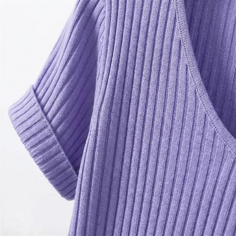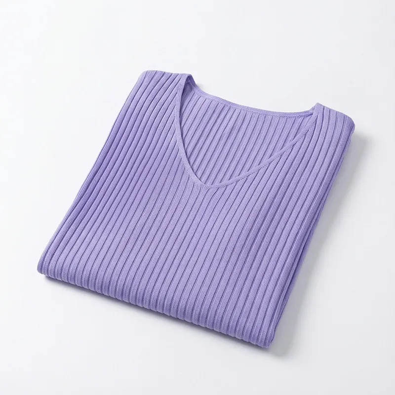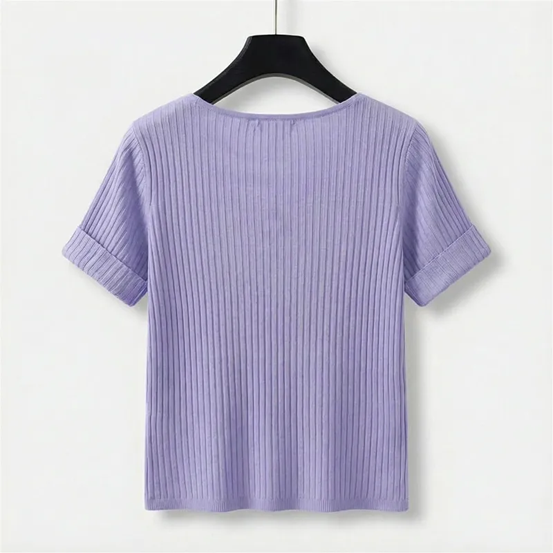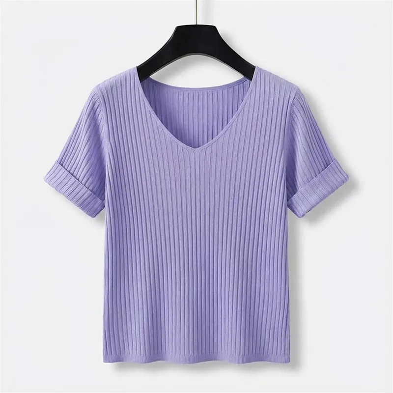Damen Strickshirt Kurzarm V-Ausschnitt Top